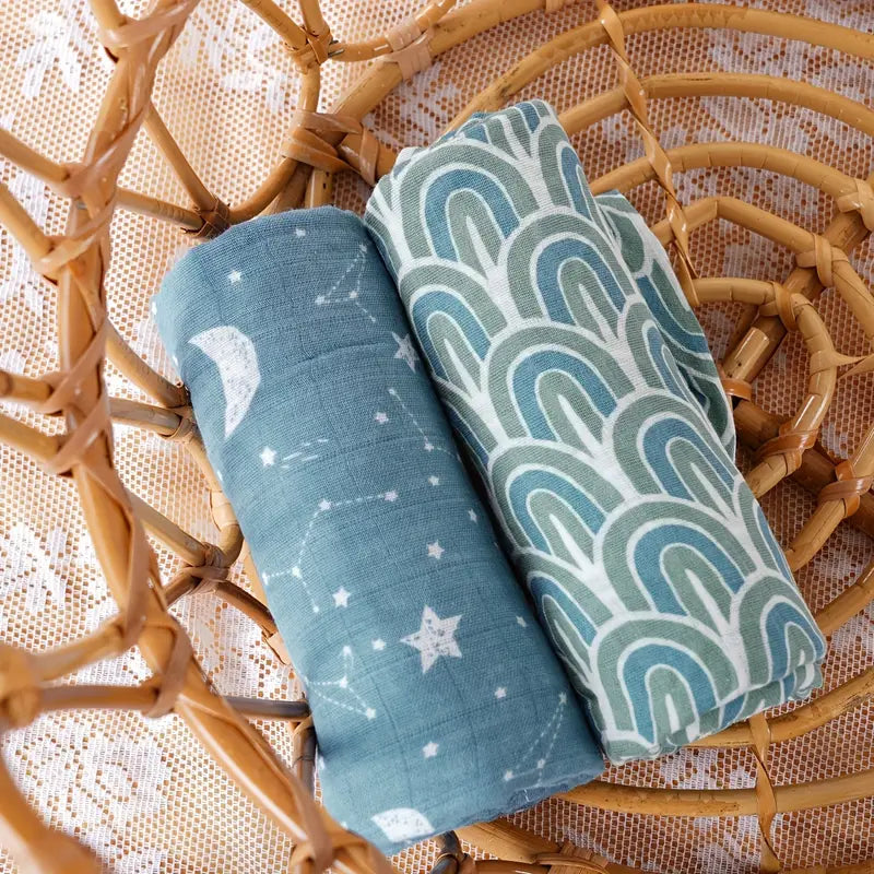 Wrap your little dreamer in our Celestial Rainbow Bamboo Muslin Swaddle Set! This magical 2-pack is designed to fill your nursery with wonder. One blanket features a dreamy night sky with moons and constellations, perfectly paired with another showcasing modern, bohemian rainbows, all in a cool and serene palette of dusty blue and sea green.