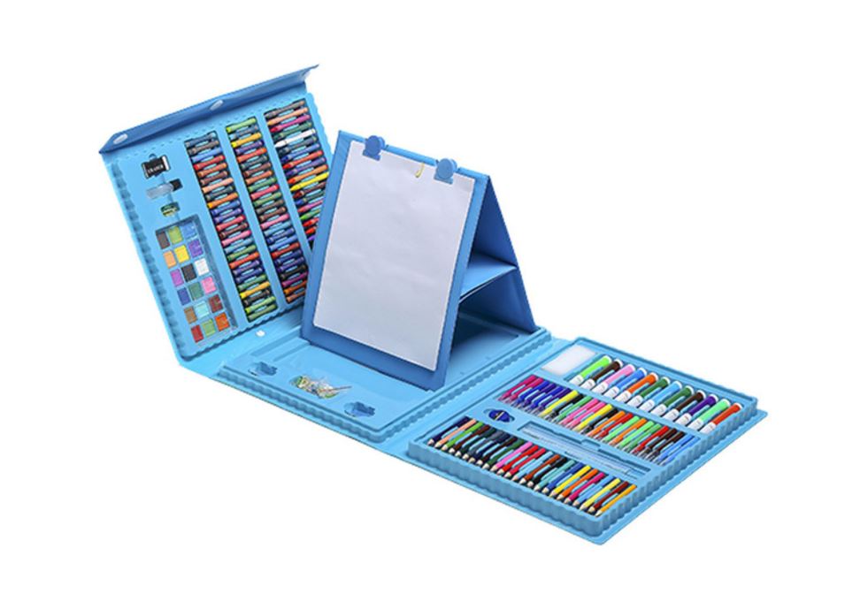 - markers, crayons, oil painting sticks, colored pencil, watercolor cakes, paper, clips, palette, eraser, sponge, brush, pencil, glue and ruler with a total of 208 pieces.