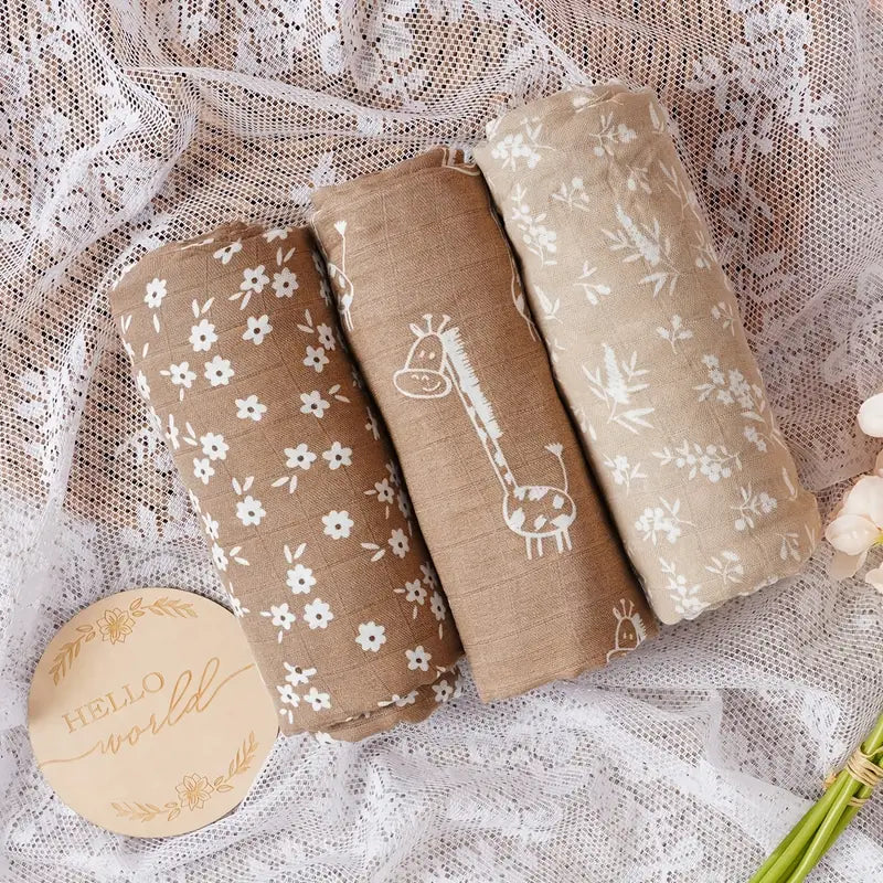 Wrap your little sprout in gentle safari dreams with our Giraffe & Blooms Bamboo Muslin Swaddle Set! This beautiful 3-pack is designed to bring a sense of calm and natural charm to your nursery. Each blanket features a unique, earthy print—from a sweet safari giraffe to delicate floral patterns—all in a sophisticated, gender-neutral palette of warm browns and soft beiges.