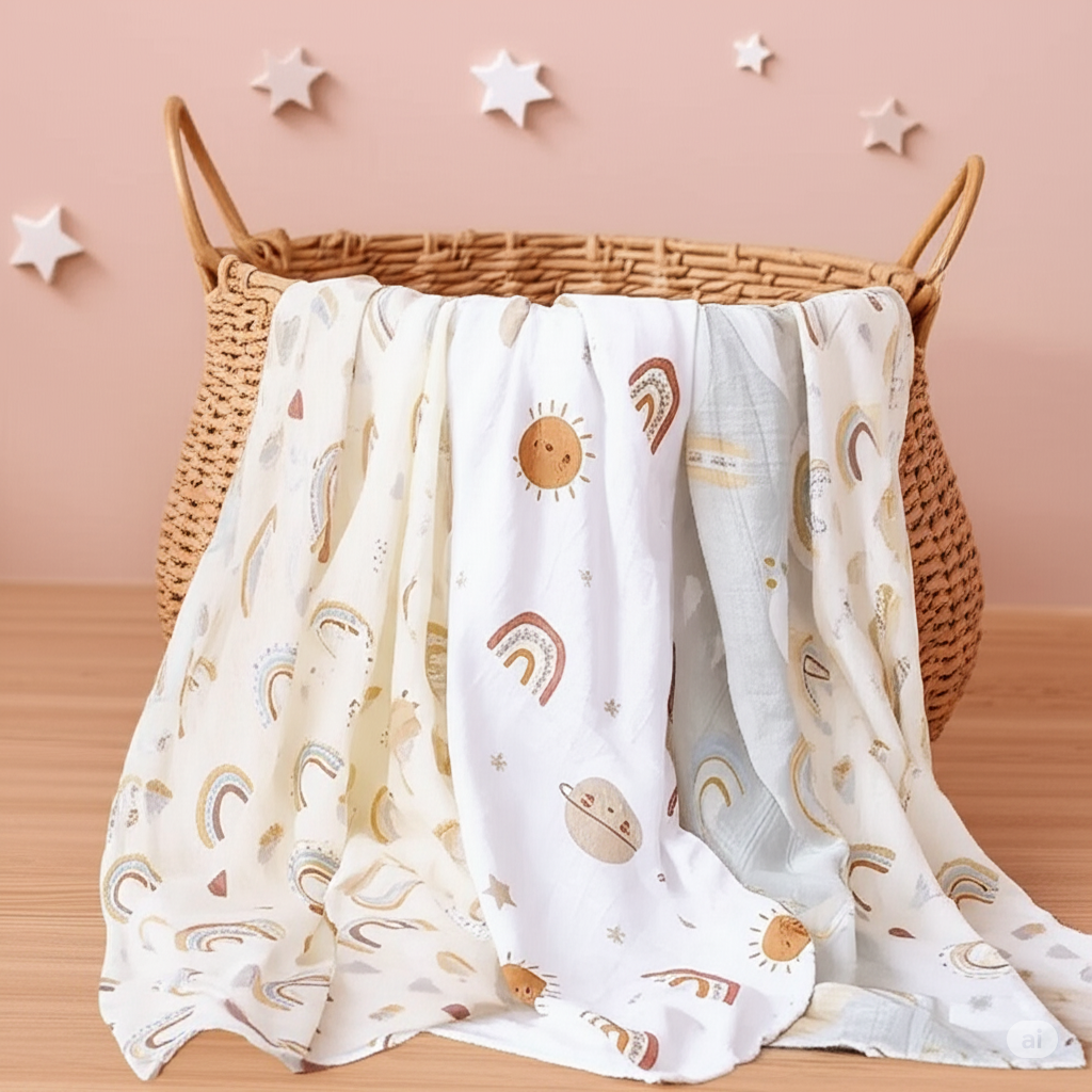 Crafted from 100% premium bamboo muslin, our swaddles are exceptionally soft, lightweight, and breathable. This remarkable fabric is perfect for a newborn's delicate skin, offering a silky touch that gets even softer with every wash.