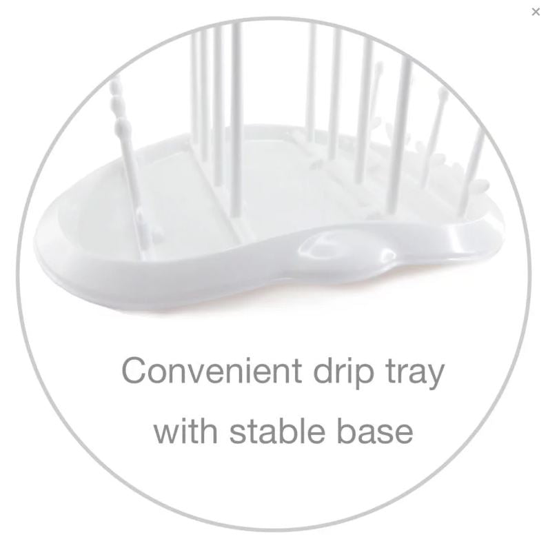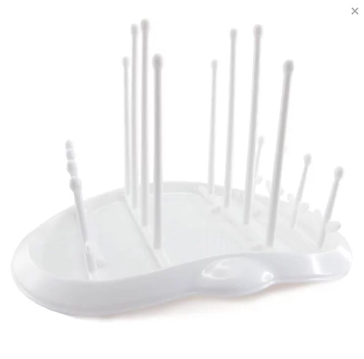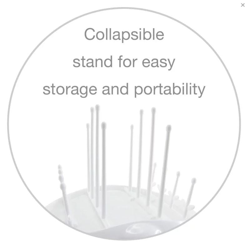 The drying rack can hold up to 8 bottles at a time with smaller pins for teats, bottle caps and rings. Extra drainage holes allow water to run off quickly and hygienically. The collapsible pins makes for easy storage and portability and it doesn’t take up much cabinet or counter space.