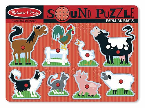 Each happy farm animal "sounds off" in its own voice when its animal puzzle piece is placed correctly in this eight-piece wooden peg puzzle! Your child will enjoy hearing all eight sounds and looking at the full-color, matching pictures under the pieces, while developing matching and listening skills with this captivating multi sensory puzzle.