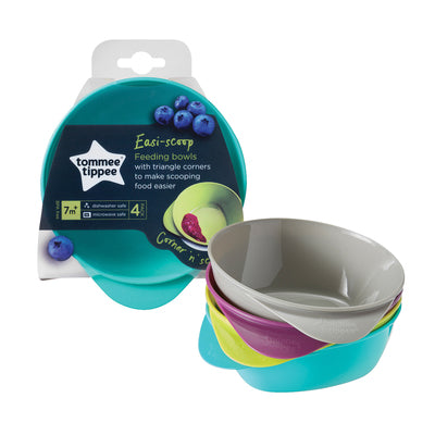 Tommee Tippee's Stack up on Easy-scoop bowls for fuss-free feeding. Tommee Tippee's Feeding Bowls come in a bumper pack of 4 - probably all you'll ever need for baby and toddler meals at home. And every one features Tommee Tippee's unique triangular base that makes it easy-peasy to scoop up food.