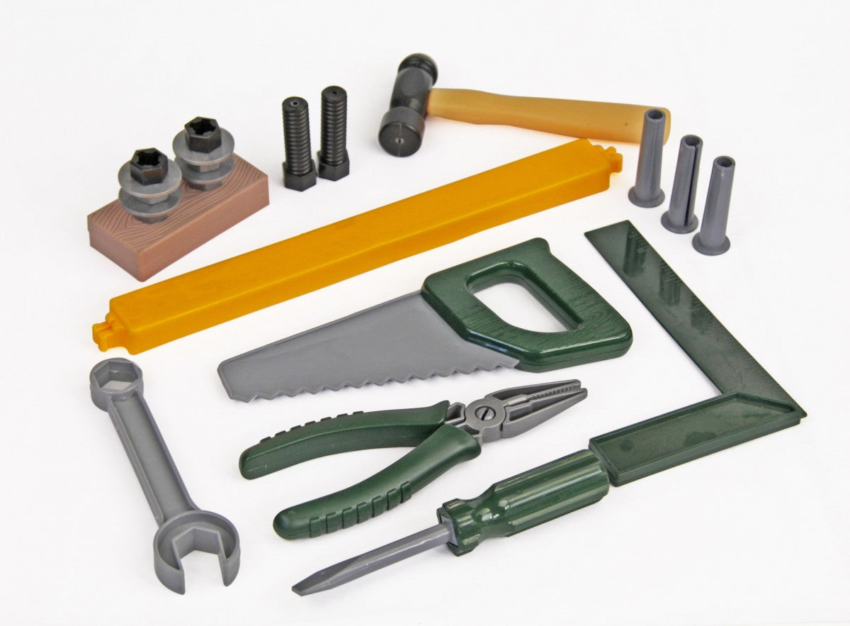 - There 9 different tools which include hammer, saw, wrench, Long nose pliers, screwdriver 2 ruler 1x L shaped ruler and 1x straight.