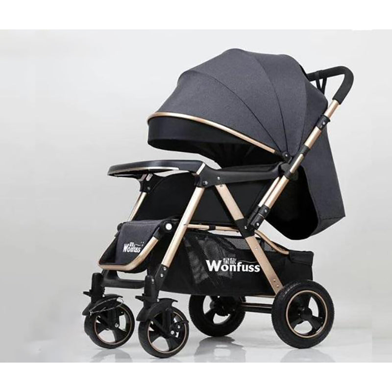 - Fully adjustable handlebar and awnings. Large crib Two-way baby stroller. Creased. Shock absorption Safe and comfortable. Large storage basket Rotate the front wheel with a suspension spring. Fully adjustable 5-point harness.