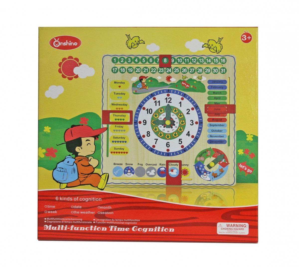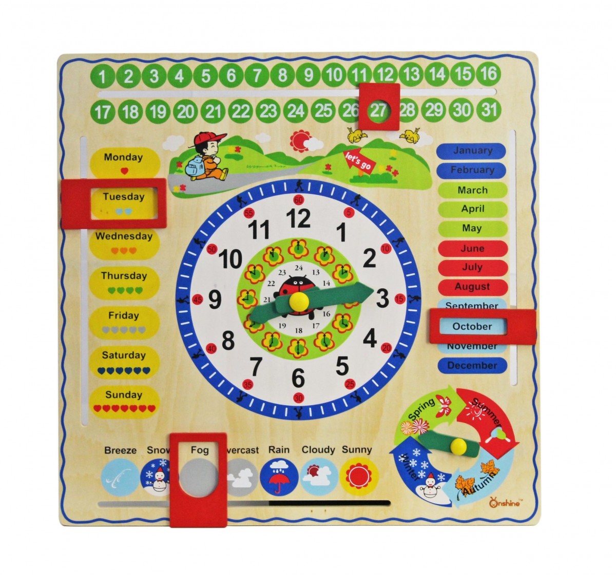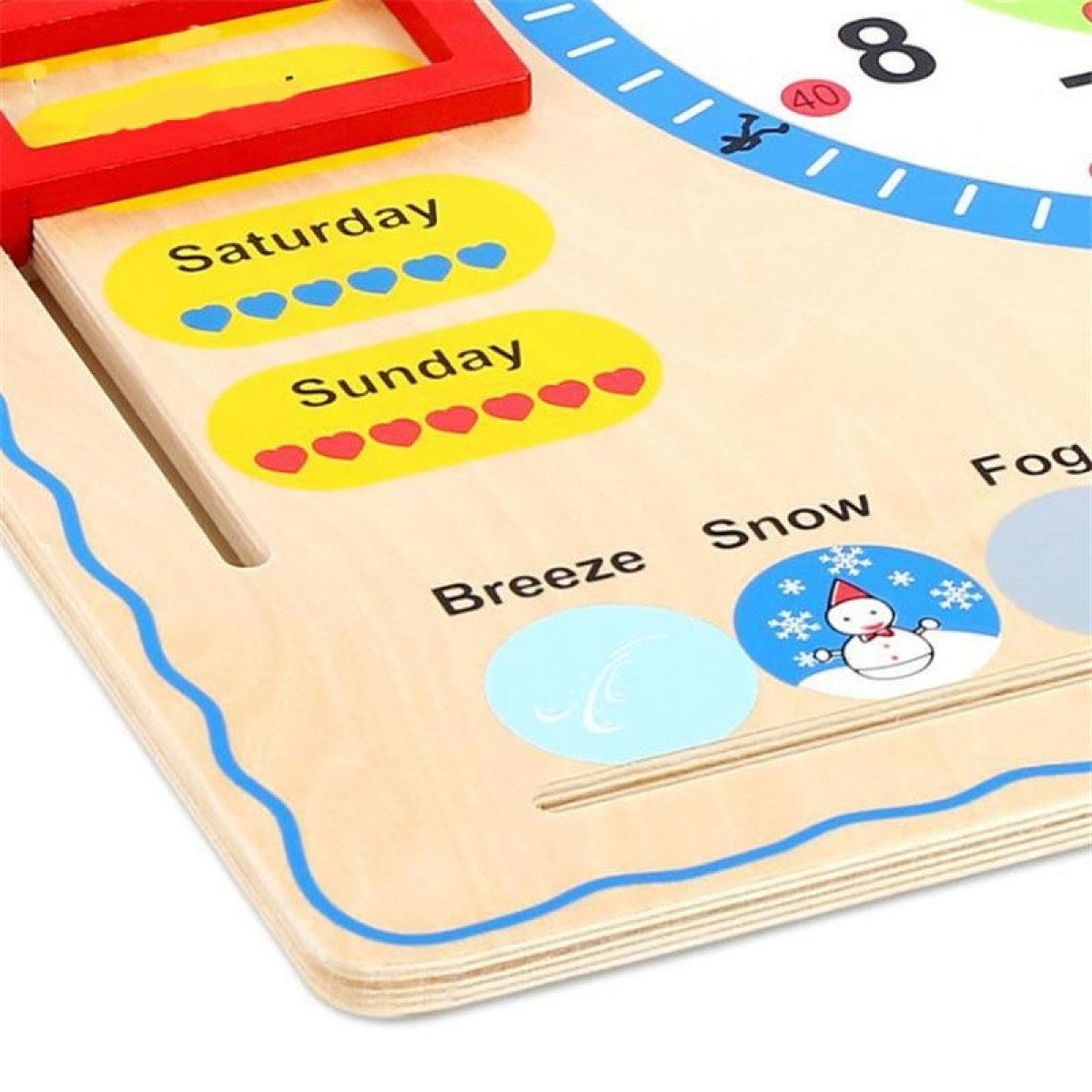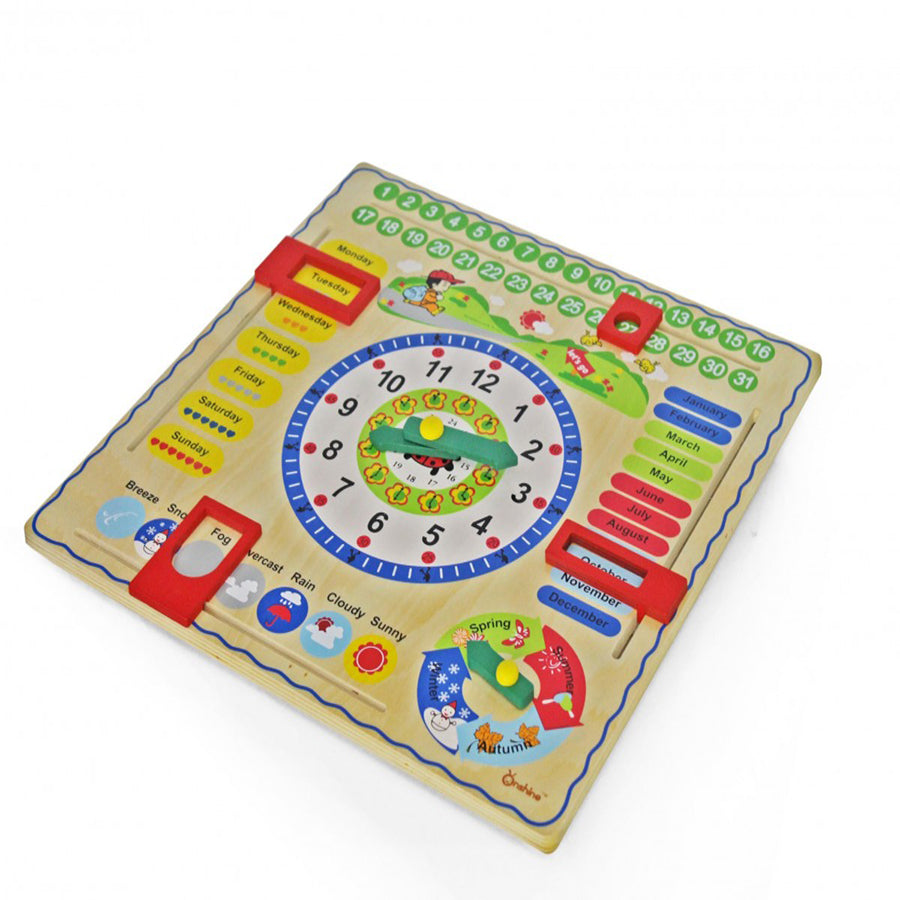 Jeronimo Wooden Learning Clock - It's time to play and learn! Teach your child all about the days of the week, months in the year, seasons, and much more, with the Jeronimo Wooden Learning Clock. The brightly colored, well-thought out design comprises of sliding charts, and dials, teaching children the all-import fundamentals of date, time of day, and time of year. The clock also has moveable hands and a weather dial to help them learn all about the different seasons.