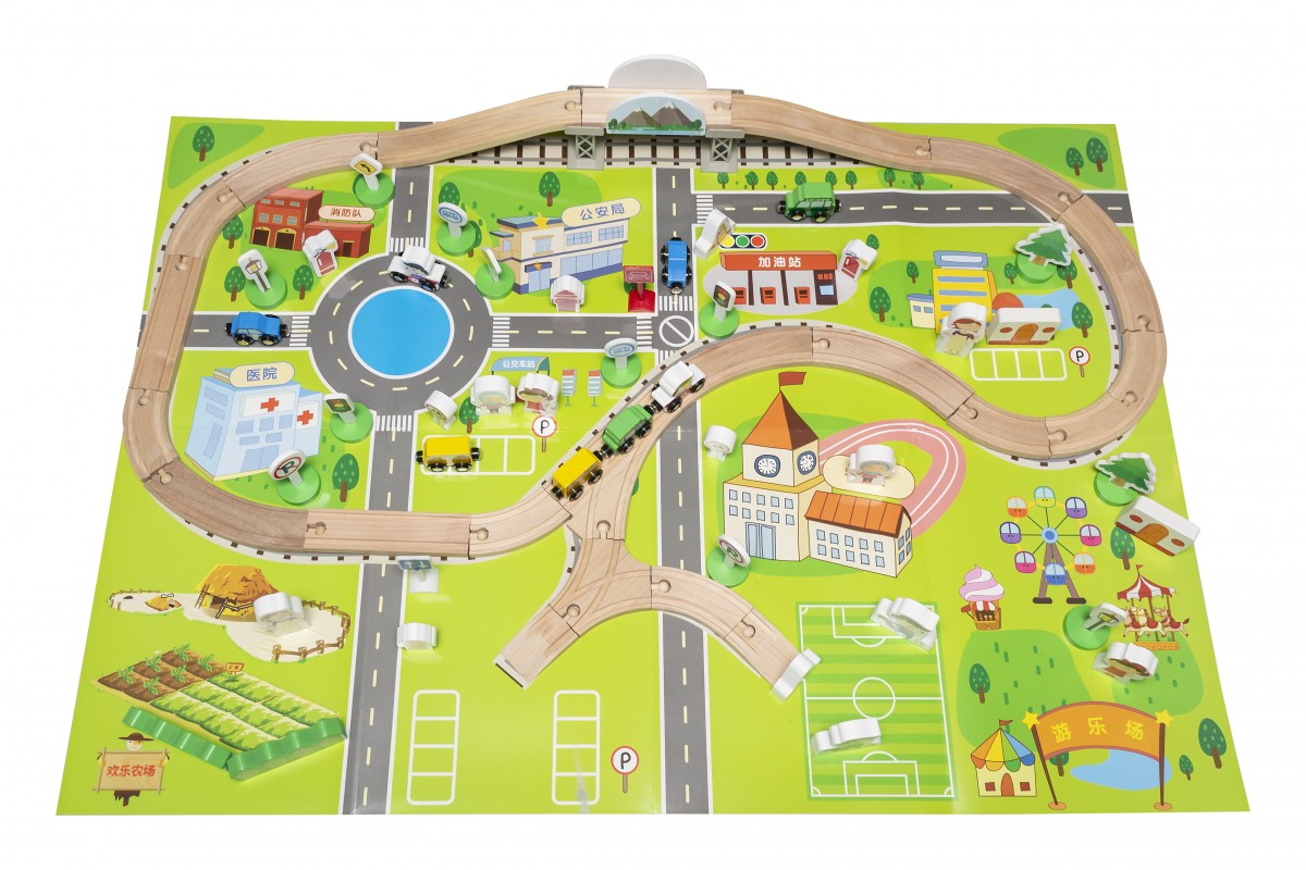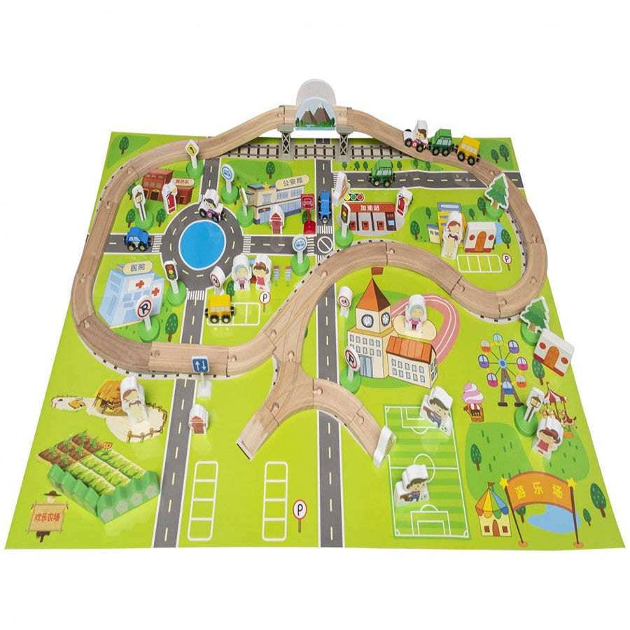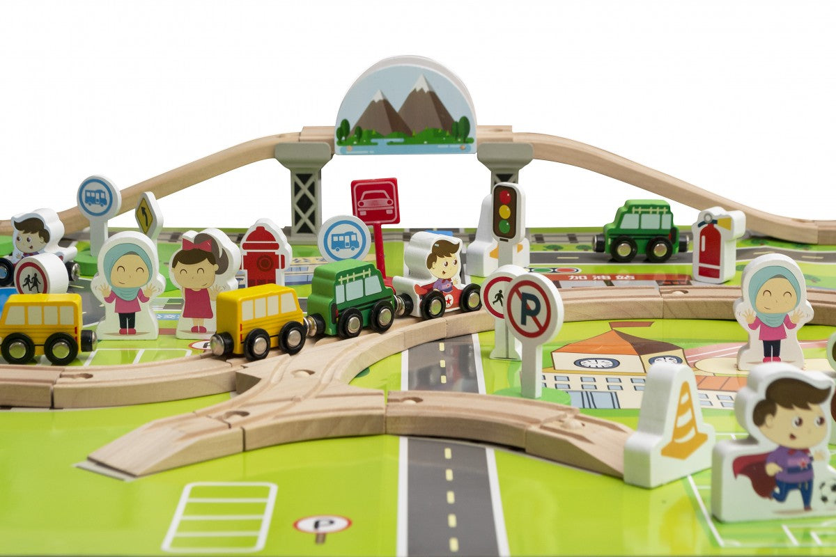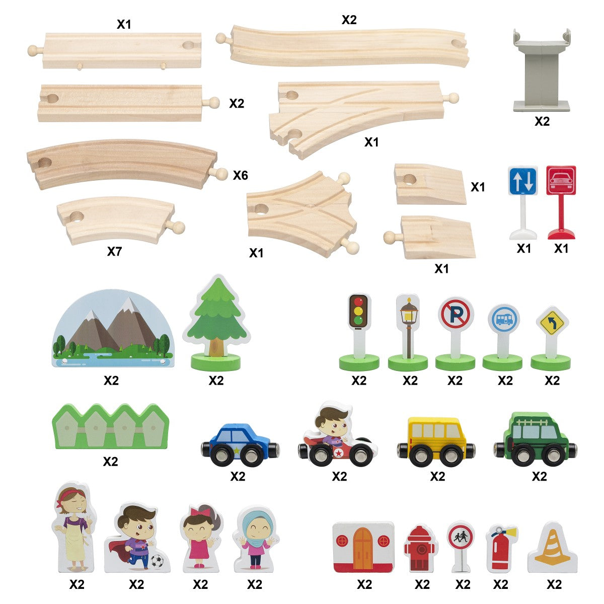 Choo! Choo! Upcoming stop: Fun! Combine learning and entertainment with this 80-piece Wooden Train Set. Your toddlers will enjoy driving the magnetic cars through a realistic urban scenery: trees, a bridge, traffic lights & signs! The 80-piece also includes 3 human figures, a house and plenty of track race parts for a longer railway track. For double fun, just flip over the scenery board and experience a different side filled with train tracks mixed with nature and urban features. It also comes with an instruction manual for multiple layouts. Let creativity speed ahead with this wooden train set.
